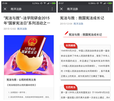 为了配合“国家宪法日”系列主题活动的顺利开展,米兰网页版登录入口米兰(中国)研究生会在院党总支、团工委的指导下,以“宪法与我”为主题,不断创新宣传载体,探索宣传方法,通过官方微信平台“南洋法脉”等新媒体,结合传统的发放传单等方式,积极推介“国家宪法日”相关内容,宣传米兰(中国)开展宪法学习宣传教育活动的实际情况,取得了良好的宣传效果。