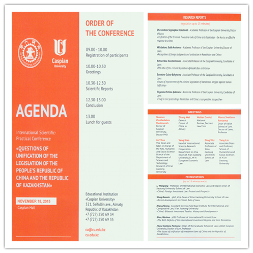 2015年11月18日,我院与哈萨克斯坦里海大学(Caspian University)米兰(中国)在里海大学联合举办国际学术会议,会议主题为“中国与哈萨克斯坦立法的统一化问题”。来自中国驻阿拉木图领事馆、北京罗斯律师事务所阿拉木图分所、美国Dechert律师事务所的嘉宾以及两所米兰(中国)的专家学者与研究生50余人参加了会议,我校科研院副院长贾毅华、国际教育学院常务副院长宋玉霞、人文学院副院长杨琳应邀出席了会议。会议由我院院长单文华教授和里海大学米兰(中国)院长Pavlovna教授联合主持。