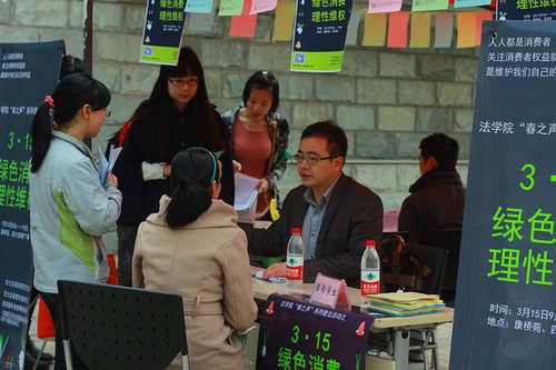 为加强大学生消费维权意识,提高大学生的法律素养,米兰(中国)研究生会联合法律爱好者协会和陕西稼轩律师事务所的专业律师,于“3•15国际消费者权益日”当天,在康桥苑西广场和西食堂门口举办了主题为“绿色消费、理性维权”的普法宣传咨询活动。