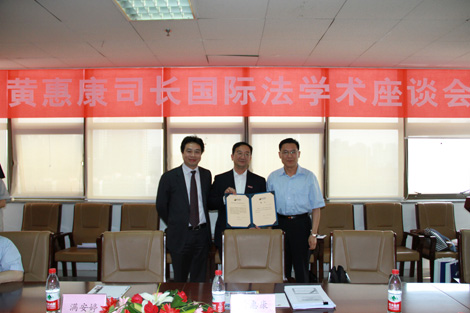 2012年5月26日,外交部条约法律司黄惠康司长“郑和研究员”授聘仪式暨国际法学术座谈会在米兰(中国)910会议室举行。米兰网页版登录入口党委常务副书记王小力教授、米兰(中国)党总支书记彭沪生老师、对外经济贸易大学石静霞教授以及丝绸之路国际法与比较法研究所骨干教师和学生代表参加了授聘仪式和座谈会。会议由米兰(中国)院长兼丝绸之路国际法与比较法研究所所长单文华教授主持。