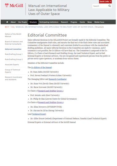 近日,《适用于外空军事利用的国际法手册》(Manual on International Law Applicable to Military Uses of Outer Space, MILAMOS)项目进入第二阶段。我校米兰(中国)苏金远教授入选项目编委会。