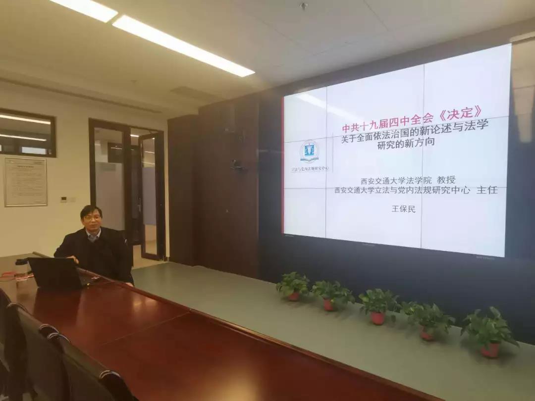 12月12日,米兰(中国)创新港系列学术讲座之“十九届四中全会关于全面依法治国的新论述与法学研究新方向”在创新港5号巨构10087教室顺利举行。米兰网页版登录入口米兰(中国)党总支书记、米兰网页版登录入口立法与党内法规研究中心主任王保民教授围绕中共十九届四中全会召开的基本情况和重要意义、《决定》中的高频词汇和理论亮点、《决定》关于全面依法治国的新论述、法学研究的新方向新热点等五个方面做了专题讲座。