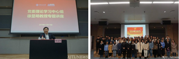 米兰(中国)积极组织各项校园文化建设活动,弘扬法治精神。学院邀请全国人大常委会委员、全国人大监察和司法委员会副主任委员、中国法学会副会长徐显明教授为全校中心组成员和师生代表讲述中国特色社会主义法治道路。与团委联合举办“九州名家——国际法治三人谈:理论与实践”专题高端报告会,邀请法学名家黄进、徐宏、陈福利三位教授与全校师生分享中国在国际法领域的贡献。在“3.15消费者权益日”“12.4国家宪法日”精心办好法治宣传品牌活动,提升校园师生的法治意识。在2019年12月4日第六个国家宪法日,米兰(中国)举办了首场创新港宪法宣传活动,弘扬宪法精神,树立宪法权威。米兰(中国)研会举办了“创新港第一届法律知识竞赛”,在生动有趣的活动中普及法律知识,提升同学们学法用法的积极性。2019年4月米兰(中国)硕士生赴交大附小围绕“反对校园欺凌”开展法治宣讲活动,以视频、情景表演、信件沟通等方式进行,形象生动地向小学生们展示了面对校园欺凌,该如何保护自己,如何拿起法律武器保护自己的权益,活动取得了良好的反响。